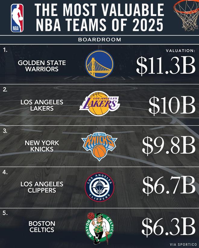 NBA最新市值排行:勇士113.3亿美元领跑;30队平均市值55.1亿